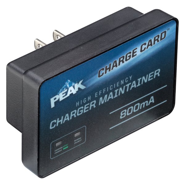 Peak Charge Card Automatic Battery ChargerMaintainer 12V 800mA Model PKC0C800. This 12 Volt Peak Charge Card Automatic Battery ChargerMaintainer is a compact fully-automatic and highly efficient unit that helps you keep your vehicles battery charged and ready. Continually keeps your vehicles battery charged 800 mA 120v60hz03amp 12 volt DC 15 watt.